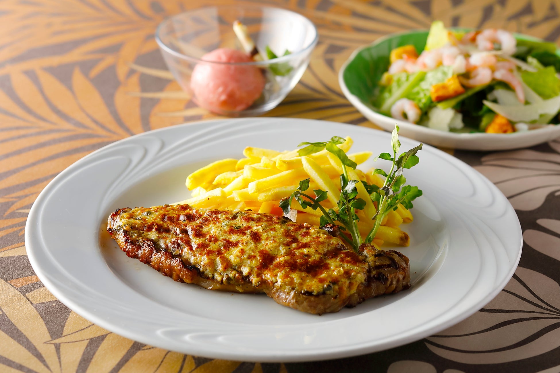 香ばしく焼き上げたU.S.産サーロインステーキに、グリーンペッパーやハーブをホイップバターで包み込んだトレーダーヴィックス伝統の「マラガシーバター」で仕上げた一皿。お肉の旨みと香り豊かなバターが食欲そそること間違いなしです。