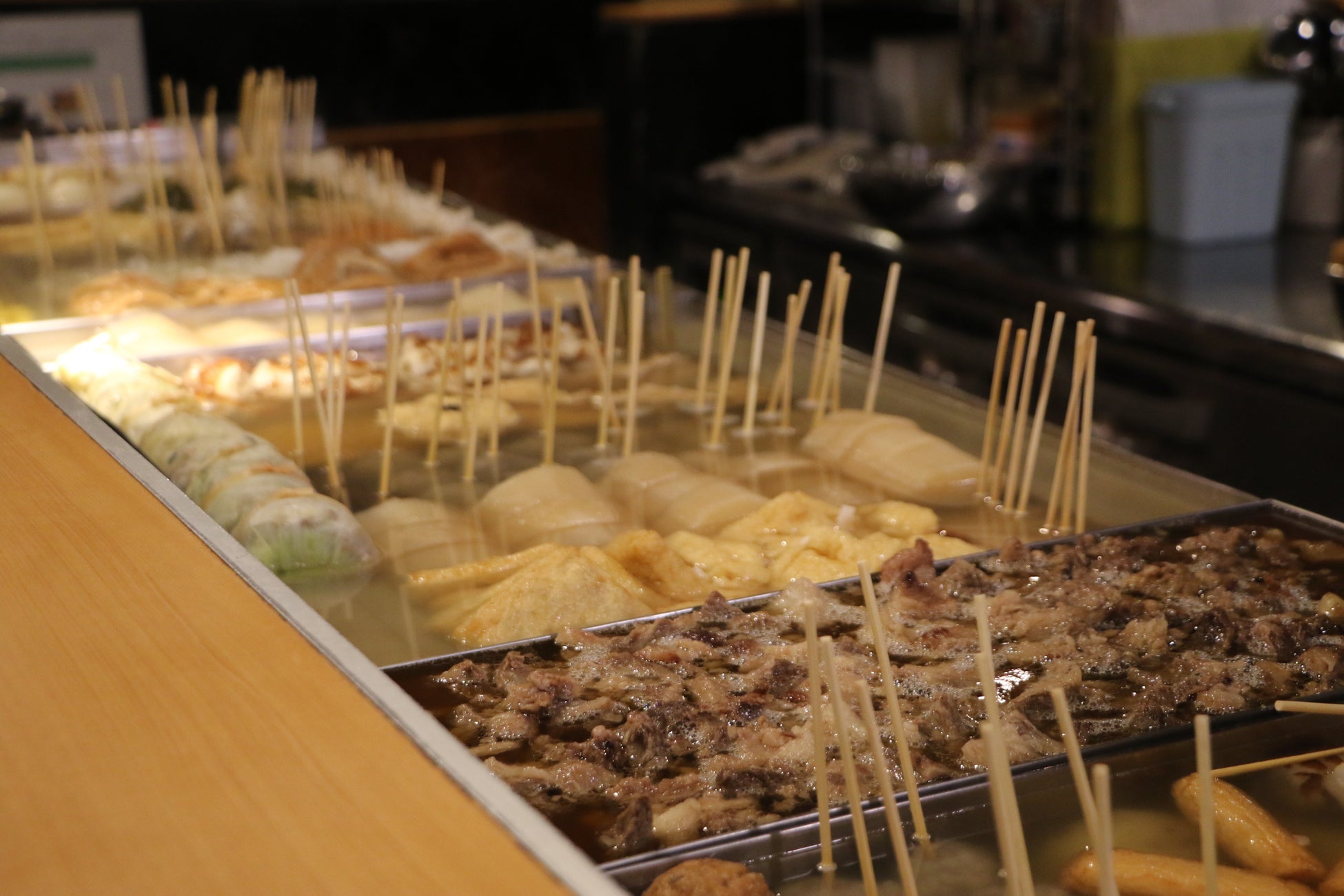 続いては、創業98年の歴史ある金沢おでんの名店【赤玉(あかだま)】へ。金沢おでんの代表的な具材である車麩、梅貝、赤巻をいただきます。出汁がおいしく、日本酒もぐいぐい進みます。創業当時からの名物メニュー「元祖 湯豆腐」には、ふたりとも「これは本当に絶対食べたほうがいい」と大絶賛!