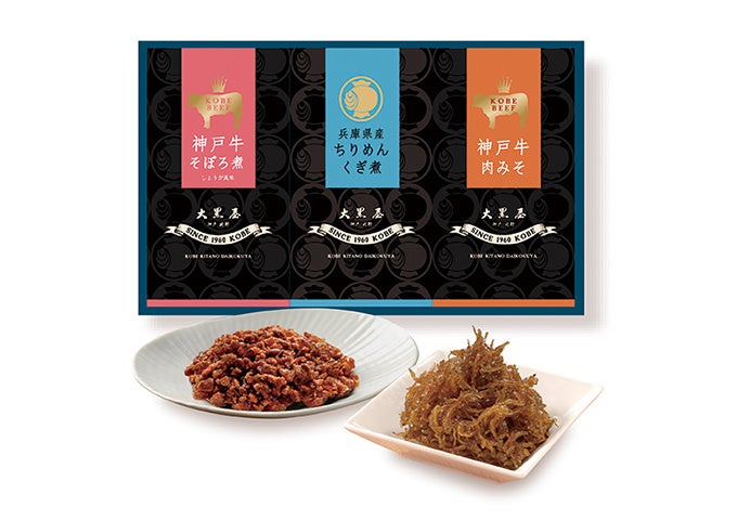 兵庫県産商品の詰合せ。人気商品の「神戸牛そぼろ煮」、「くぎ煮」風に甘辛く炊き上げた「ちりめんくぎ煮」、新商品の「神戸牛肉みそ」を詰め合わせました。原材料も製造もすべて兵庫県産にこだわりました。