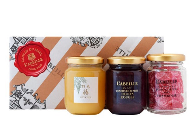 【セット内容】群馬 藤(125g)、はちみつコンフィチュール 3種のベリー(110g)、ボンボンフルール ミエル ラズベリー(58g)