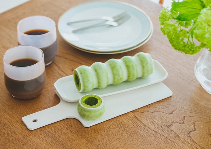 新緑の季節に香る!発酵バターとリューベック産マジパンを使用したプレーン生地をベースに、抹茶を入れて焼き上げたバウムクーヘンキュートです。京都・宇治茶の「丸久小山園」の抹茶「青嵐」を使用。一番茶で鮮やかな緑とまろやかさが特徴。