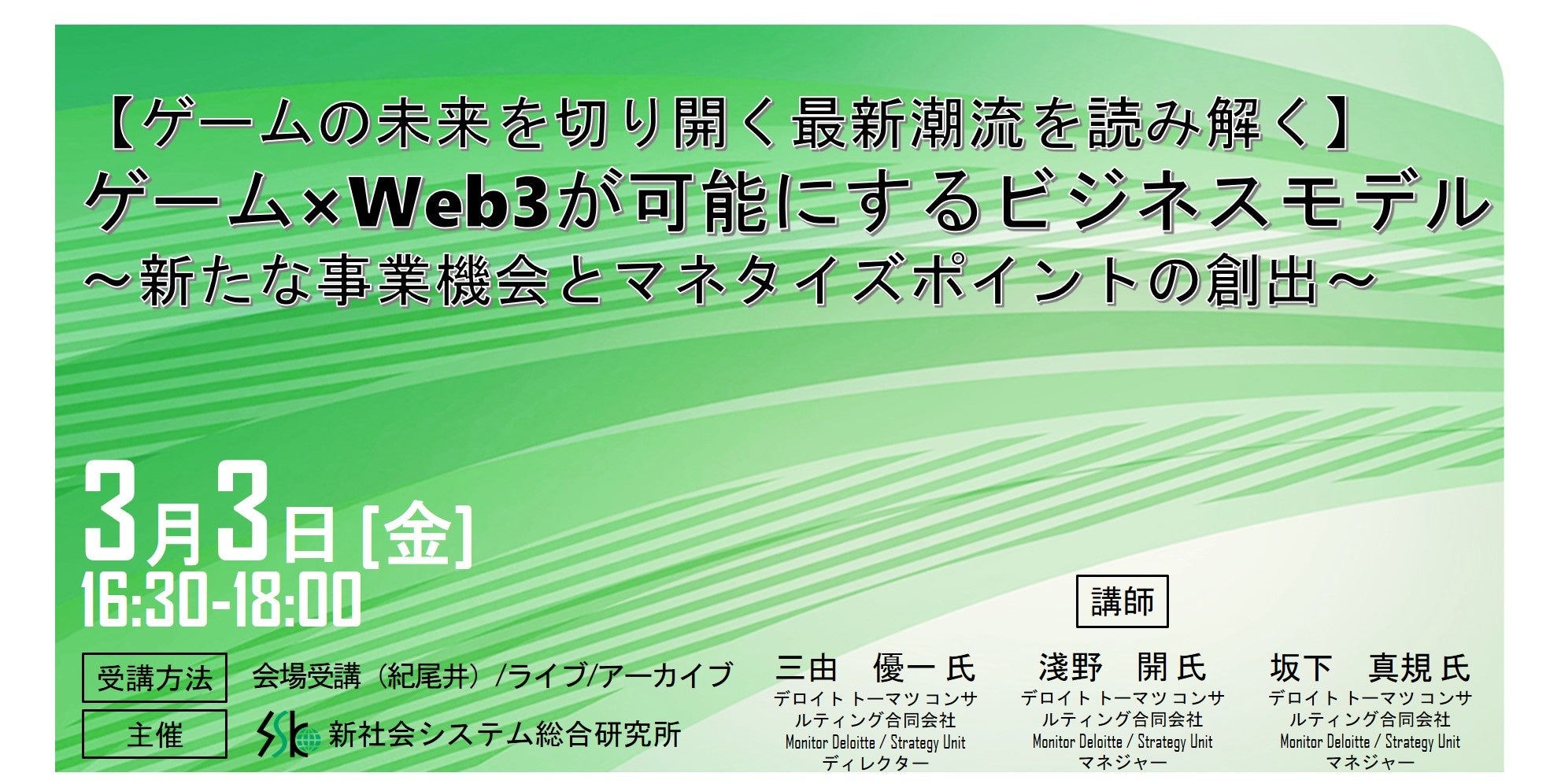 「ゲーム×Web3が可能にするビジネスモデル」と題してデロイト トーマツ コンサルティング(合) 三由 優一氏/淺野 開氏/坂下 真規氏のセミナーを2023年3月3日(金)に開催!!