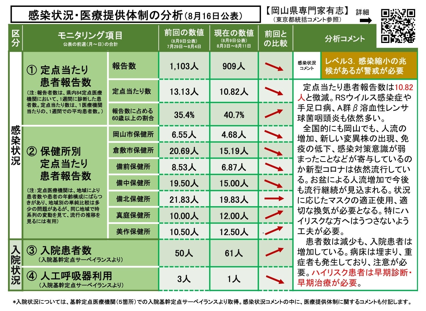【岡山大学】岡山県内の感染状況・医療提供体制の分析について(2024年8月16日現在)