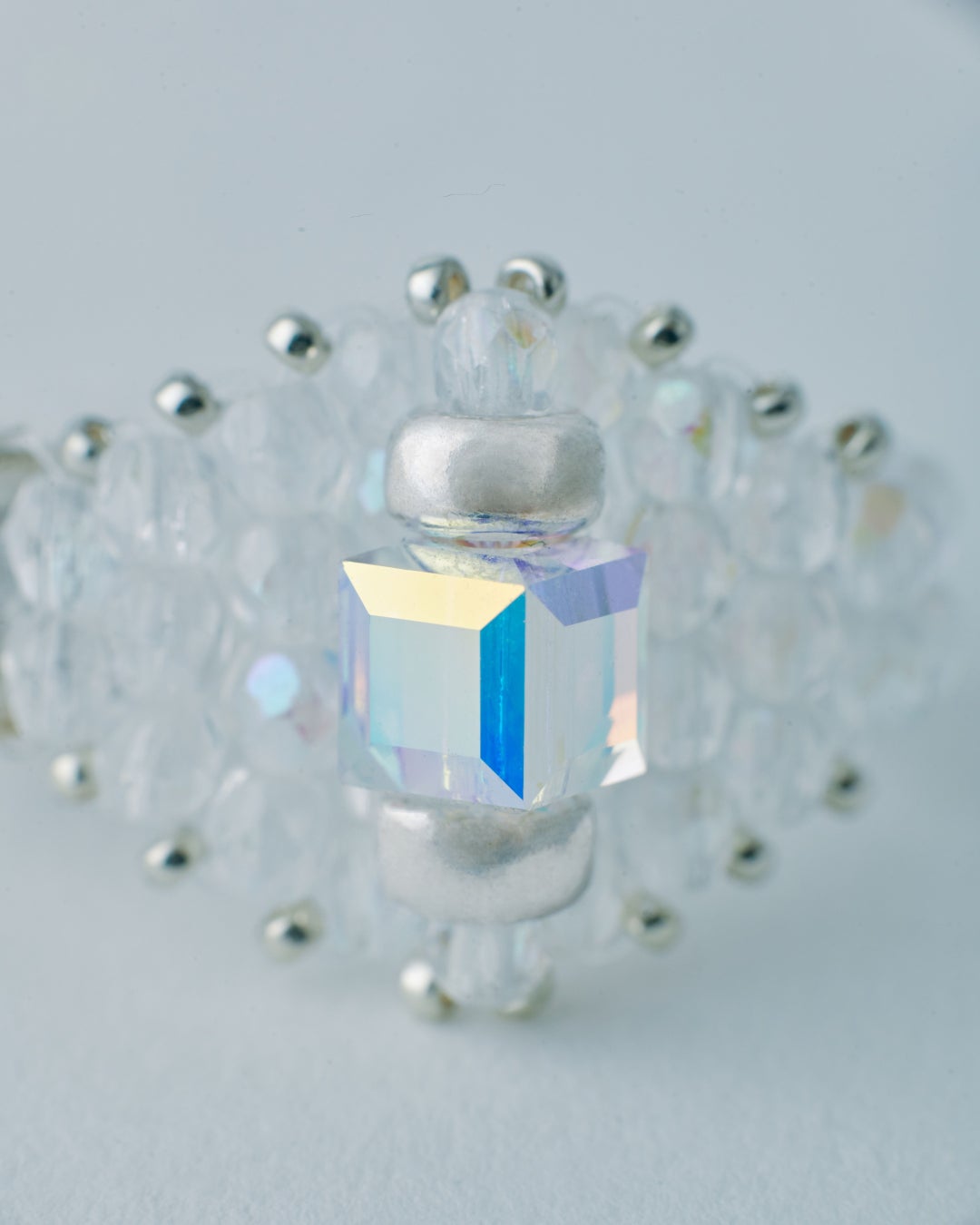 その記憶をもとに、ヨーロッパのメーカーによるクリスタルガラスビーズを採用。卓越した製造技術と精密なカッティングによって生まれる透明感と輝きは、他に類を見ない存在感を放ちます。