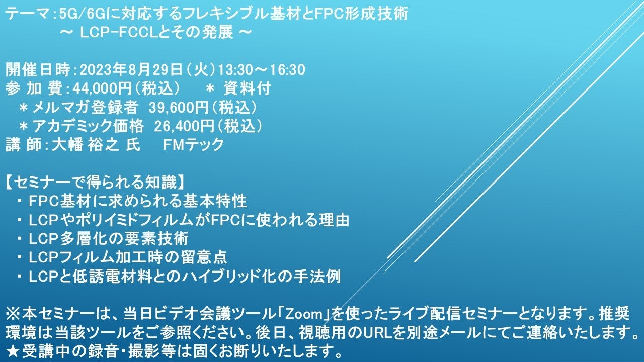 先端技術情報や市場情報を提供している(株)シーエムシー・リサーチ(千代田区神田錦町: https://cmcre.com/ )では、 各種材料・化学品などの市場動向・技術動向のセミナーや書籍発行を行っておりますが、 このたび「5G/6Gに対応するフレキシブル基材とFPC形成技術 〜 LCP-FCCLとその発展 〜」と題するセミナーを、 講師に大幡 裕之 氏 (FMテック)をお迎えし、2023年8月29日(火)13:30より、 ZOOMを利用したライブ配信で開催いたします。 受講料は、 一般:44,000円(税込)、 弊社メルマガ会員:39,600円(税込)、 アカデミック価格は26,400円(税込)となっております(資料付)。