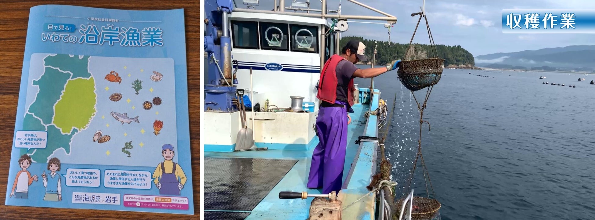 その岩手の海の豊かさ・大切さを子どもたちに学んでもらい、海について考えてもらおうと、一般社団法人海と日本プロジェクトin岩手は各機関(監修:岩手県教育委員会事務局学校教育室/岩手県農林水産部水産振興課/公益財団法人 岩手県漁業担い手育成基金、協力:日本財団「海と日本プロジェクト」/岩手県漁業共同組合連合会/いわて水産アカデミー運営協議会)と共同で、小学校社会科副教材「いわての沿岸漁業」を作成しました。