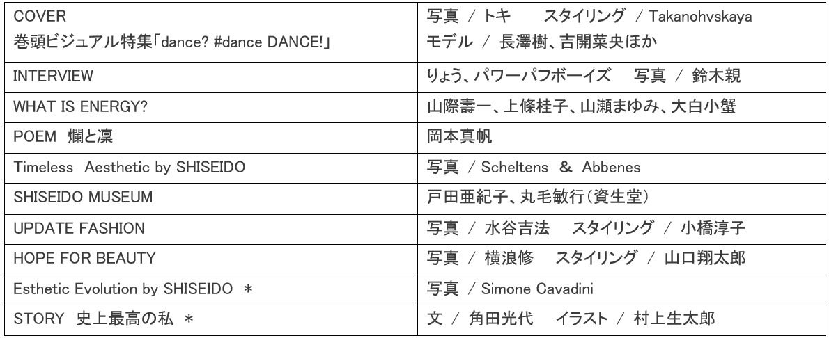 ビジュアル特集や美しく力強い生き方へのインタビュー、エナジーについて多角的に掘り下げた考察記事など、さまざまな形のエナジーをあらわしたコンテンツをお届けします。本号は、資生堂関連施設および全国の書店など、約60ヵ所にて無料配布します。