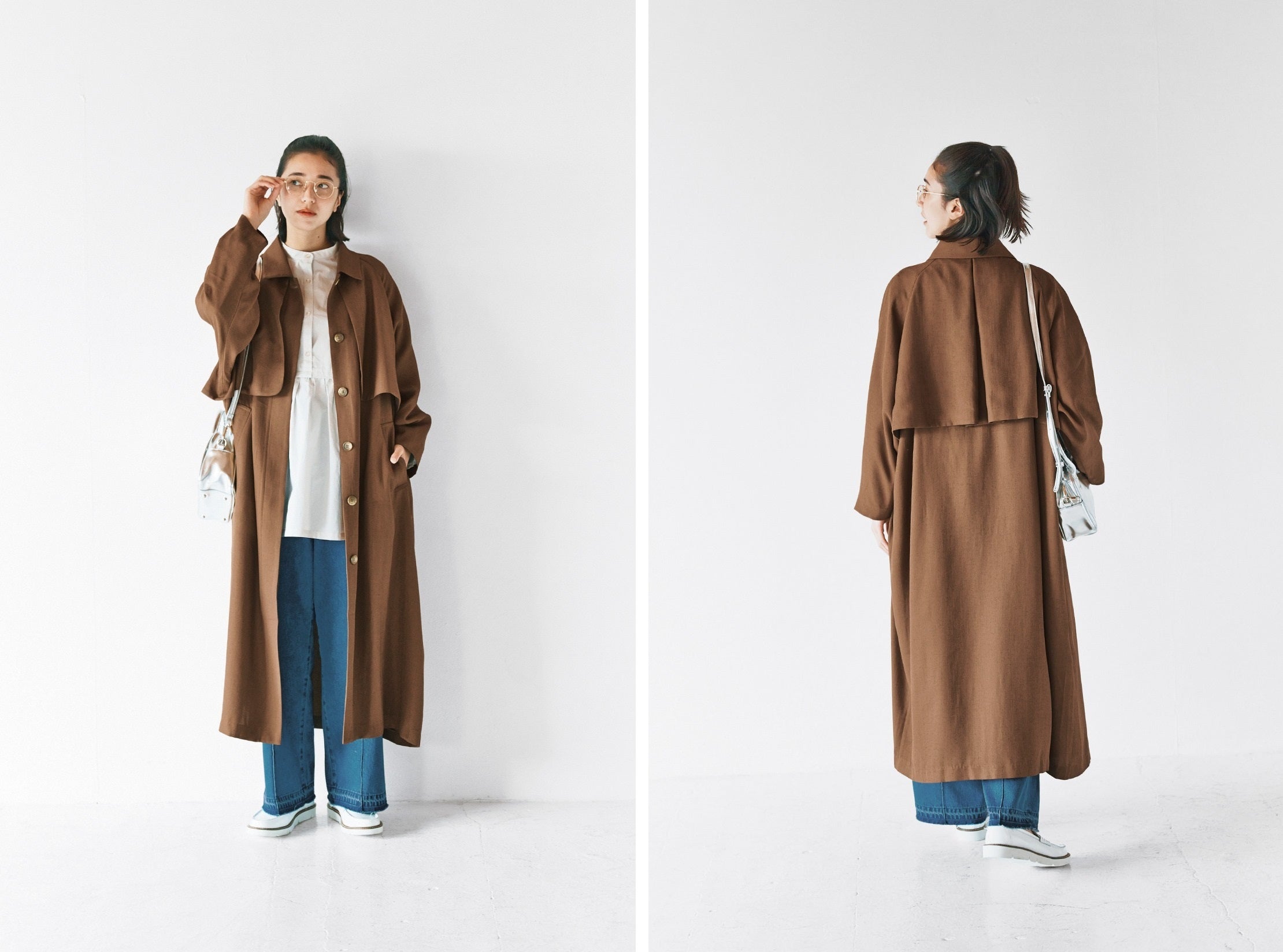 オーソドックスな使い勝手のよさを保ちつつ、コーディネイトの仕上げとして使える、ワンランク上のデザインのコート。ベースは、ゆったりとした一枚仕立てのステンカラーコートで、背中のアンブレラヨークからつながるボレロ風のデザインでアヴェクモワらしいひねりをプラスしました。