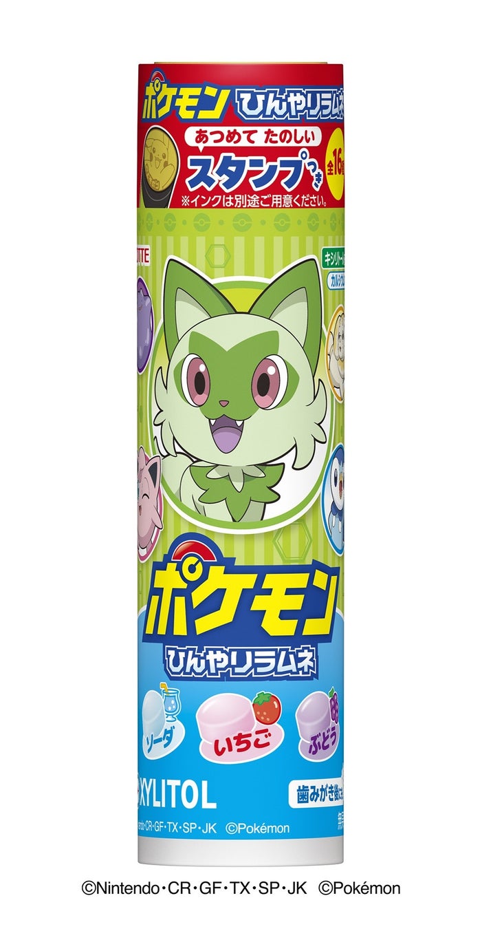 株式会社ロッテは4月22日(火)に「キシリトールポケモンひんやりラムネ」を全国で新発売します。この商品は幅広い年代に愛されるポケットモンスター(以下ポケモン)がデザインされており、キシリトールならではのひんやりした味わいが楽しめるラムネです。味はお子様が好きなソーダ、いちご、ぶどうの3種類をアソートし、カリッとした食感が楽しめる糖衣ラムネに仕上げました。筒型の容器のフタ部分にポケモンスタンプ(全16種類)がついていて、ラムネを召し上がっていただいた後も、スタンプ(*1)としてお楽しみいただけます。お出かけのときや歯磨き後にも、ぜひお試しください。