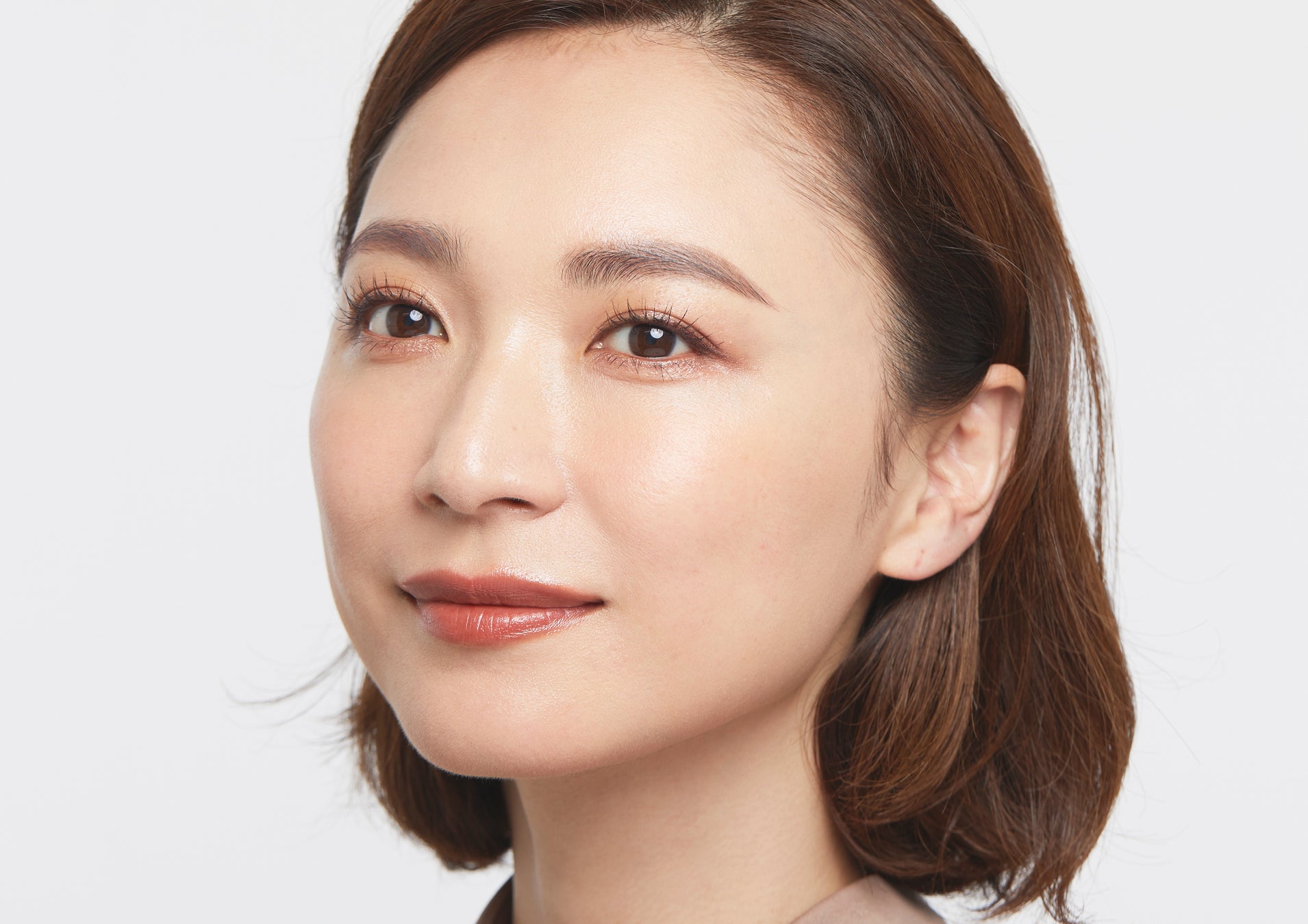 つやが出るタイプの下地とスキンケア成分配合ファンデーションを、それぞれほおや額の丸みを意識して顔の中央から外側に伸ばしていきます。フェイスパウダーはフェイスラインの引き締めて見せたいところに2度重ねづけをし、しっかりとつやを抑え、一方で、ハイライトを眉上、鼻根、ほおの高い位置などに使用することでつやを上乗せします。顔の中心部分と輪郭部分につやとマットの質感のコントラスをつけ、立体的に仕上げ、小顔に見せるテクニックです。