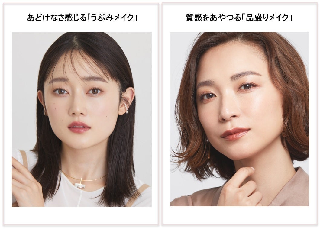 23年秋冬のメイクアップとして、ぷっくりとしたリップメイクの表現をポイントに、うっすらとフィルターをかけるように広範囲にのせるチークを組み合わせ、透明感あふれるムードであどけなさを感じる「うぶみメイク」を提案します。