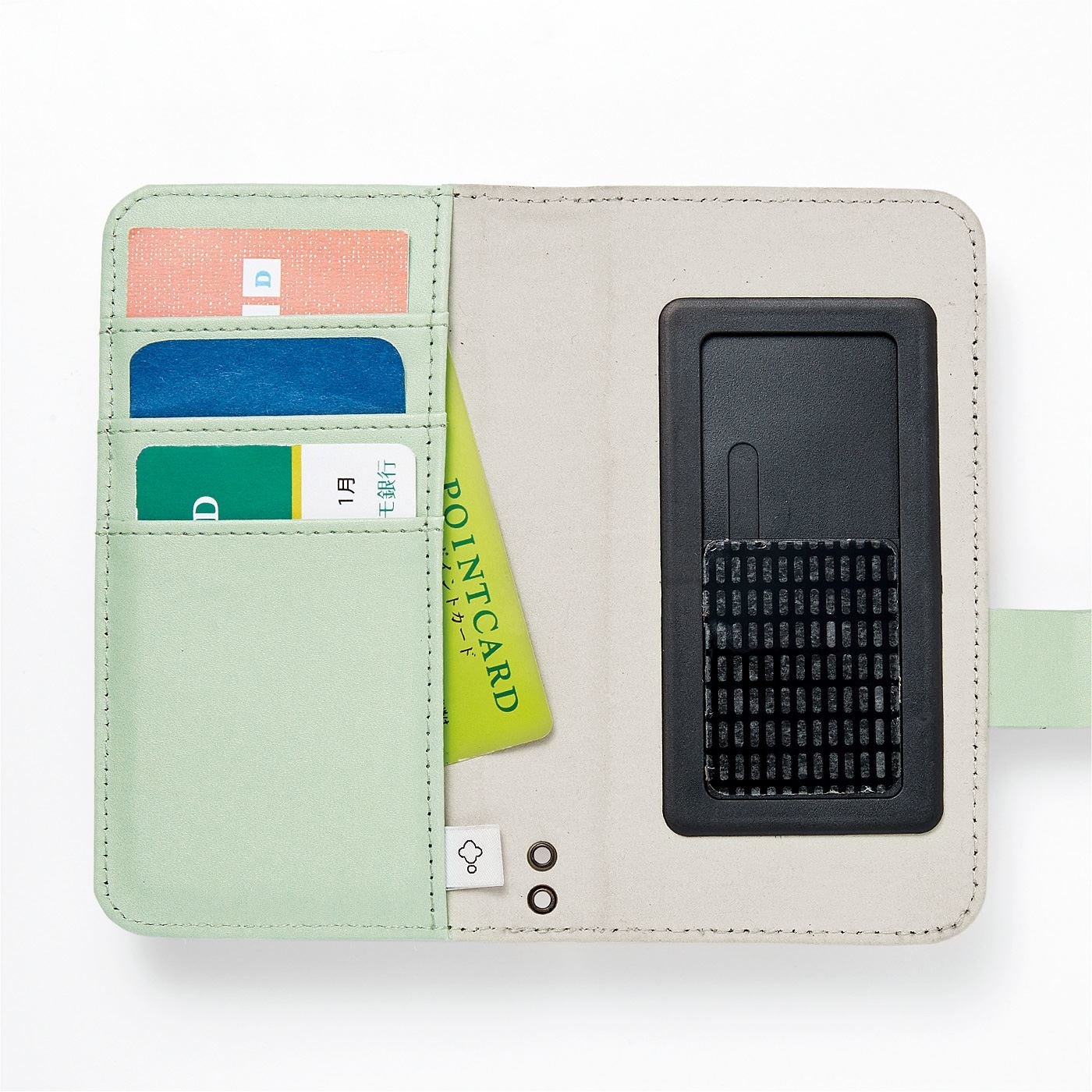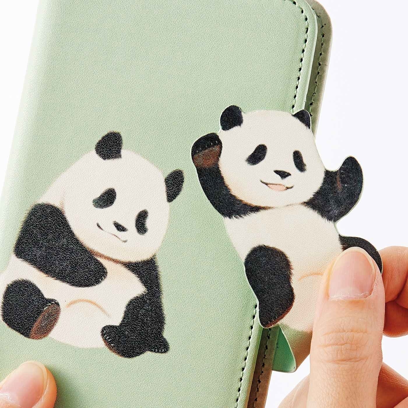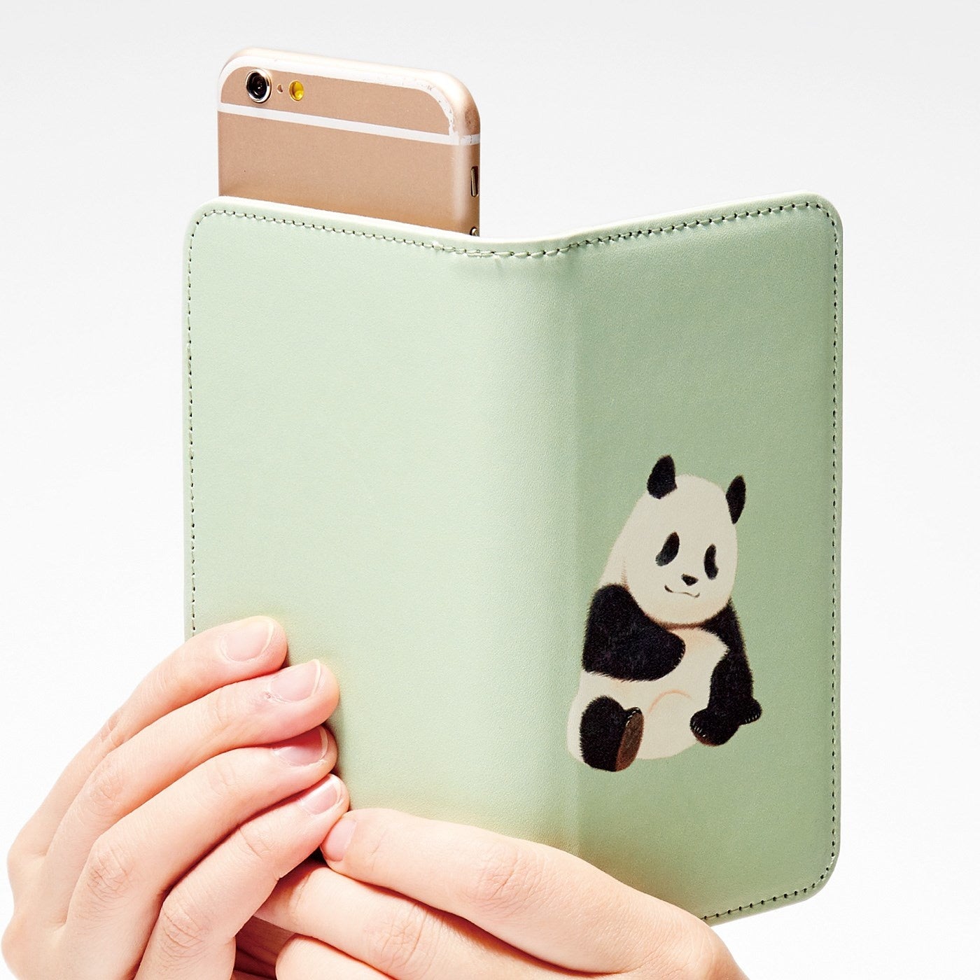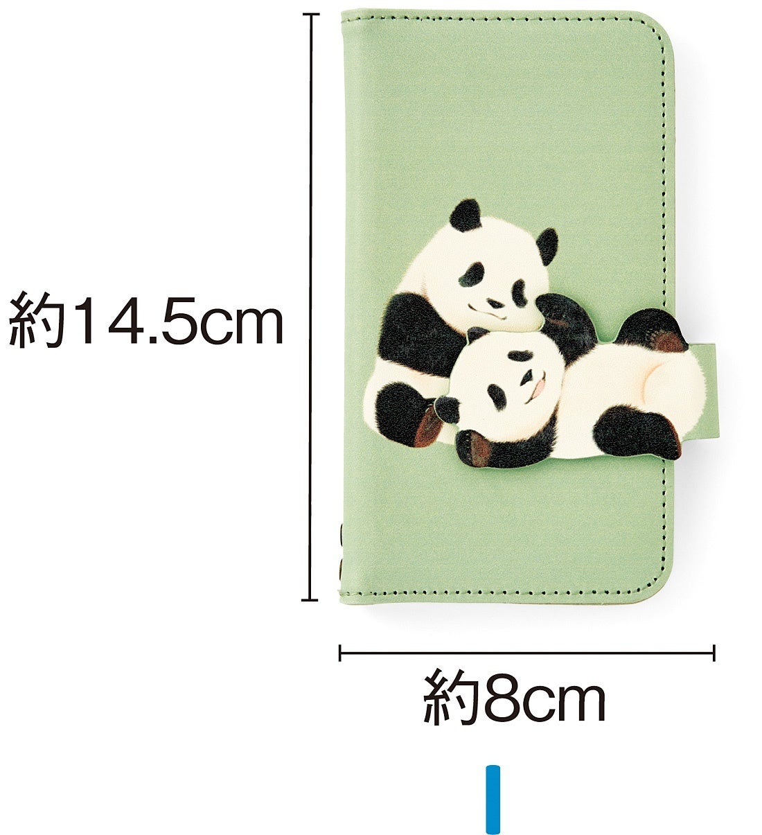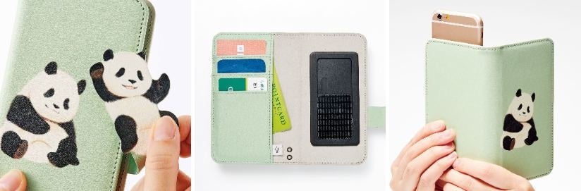 スマホを開け閉めすると、双子のパンダがじゃれあっているように見えるデザインです。開くとカードポケット3つに、大きめのポケットが1つ付いていて、お手持ちのストラップを付けられる穴もあります。写真を撮るときはスマホを上へスライドさせるだけなので、カメラの使用もスムーズです。