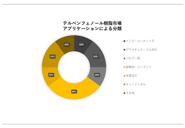 接着剤・シーラント向けテルペン樹脂の需要増―テルペンフェノール樹脂は、接着強度、耐水性、耐薬品性に優れ、特に接着剤・シーラント業界を中心に様々な用途で使用されるようになってきています。この業界は、包装、自動車、建築、木工などの最終用途産業における接着剤およびシーリング剤の需要の増加、ならびに環境に優しく持続可能な接着剤およびシーリング剤の需要の増加により、テルペンフェノール樹脂の需要増加の主要因になっています。調査レポートによると、世界の接着剤およびシーラント業界は、予測期間中に5.7%のCAGRで成長すると推定され、テルペンフェノール樹脂市場の主要な成長ドライバーとなる見込みです。