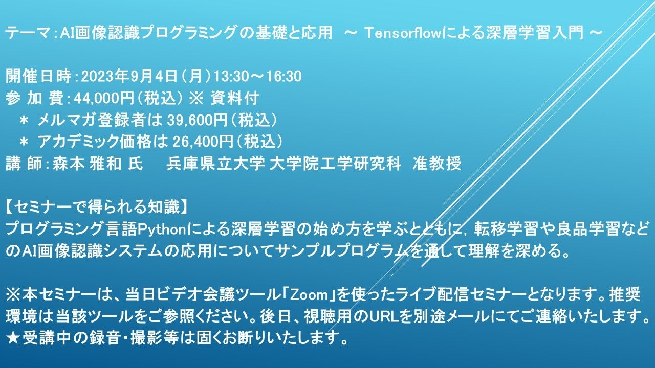先端技術情報や市場情報を提供している(株)シーエムシー・リサーチ(千代田区神田錦町: https://cmcre.com/ )では、 各種材料・化学品などの市場動向・技術動向のセミナーや書籍発行を行っておりますが、 このたび「AI画像認識プログラミングの基礎と応用 ~ Tensorflowによる深層学習入門 ~」と題するセミナーを、 講師に森本 雅和 氏 (兵庫県立大学 大学院工学研究科 准教授)をお迎えし、2023年9月4日(月)13:30より、 ZOOMを利用したライブ配信で開催いたします。 受講料は、 一般:44,000円(税込)、 弊社メルマガ会員:39,600円(税込)、 アカデミック価格は26,400円(税込)となっております(資料付)。