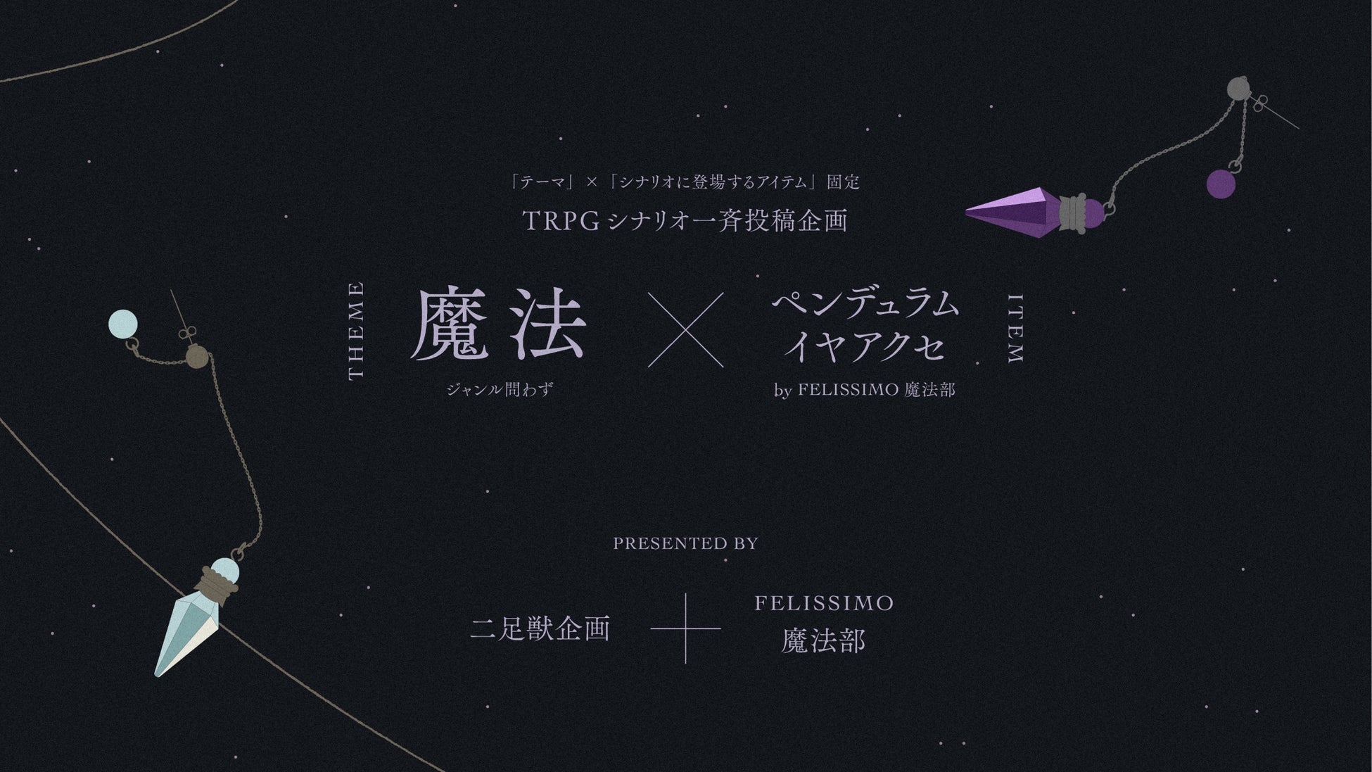 フェリシモが展開する部活動「魔法部®」は、TRPGシナリオ一斉投稿企画「きっと魔法遣いだったあなたたちへ」を3月1日に発表、特設サイトを公開し、公式Twitterアカウント運用開始しています。TRPG企画主催の先駆者である「二足獣企画」とのコラボ開催です。シナリオのテーマは“魔法”、シナリオ内に必ず魔法部の商品「魔法部ペンデュラムピアス」を登場させることが条件です。制作されたTRPGシナリオは8月8日〜8月14日期間中にTwitterにてハッシュタグをつけて公開予定です。詳細は特設サイトや公式Twitterアカウントでチェックできます。