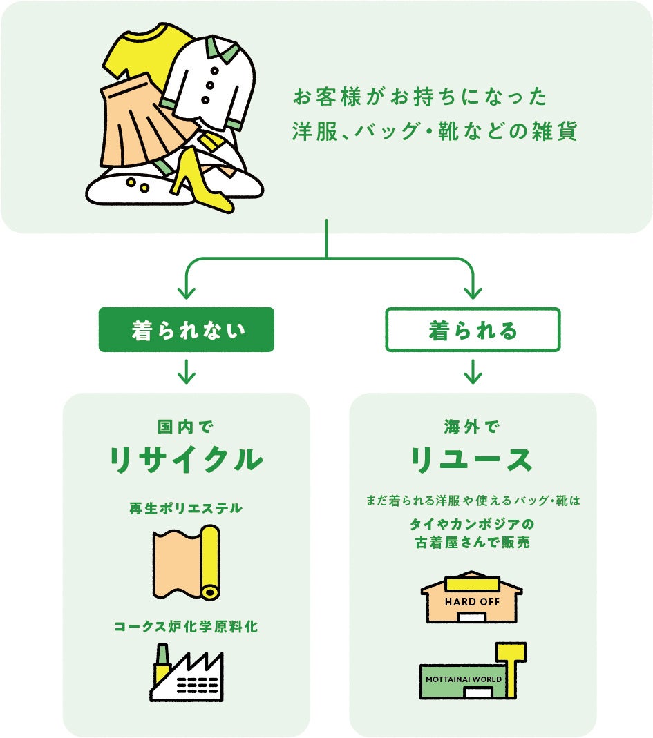 エコフリサイクルキャンペーンでは、お客様のいらなくなったお洋服や靴・バッグなどを回収し、お客様に代わり、大丸・松坂屋がリユースやリサイクルを通して、環境のために様々なカタチで役立てています。