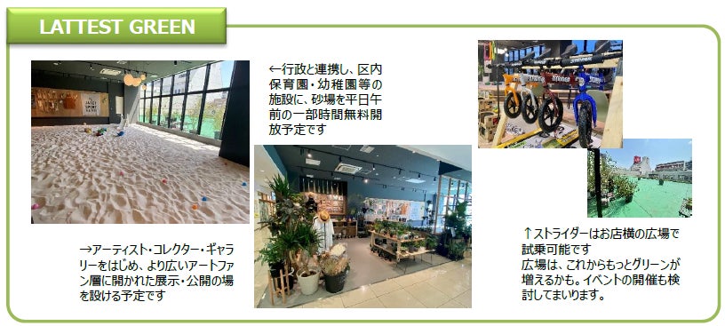 この度のリニューアルに際して、テナントを通じ近隣のみなさまとの連携・共生に向けた取り組みを進めてまいります。「ユニクロ」では地元企業様と協業したオープン販促を予定しており、地元商店街とも連携した取り組みも行います。また、3月24日にオープンしました「LATTEST GREEN」でも、【砂場】や【イベント】、【展示の場としての活用】などを通じ地域の新たなコミュニティの場の創造を目指します。