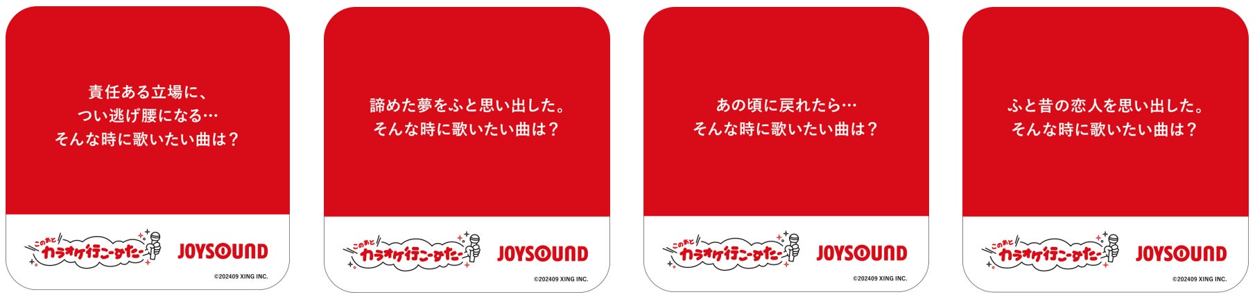 このたびの取り組みでは、9月1日(日)から「しゃぶしゃぶ すきやき 個室ダイニング 天空 品川港南口店」のディナータイム(全日15:00~23:30)にて、「このあと、カラオケ行こーすたー」全4種のコースターを配布します。コースターの表面では、「責任ある立場に、つい逃げ腰になる…そんな時に歌いたい曲は?」などと、社会人のあるあるシチュエーションと歌いたくなる曲を想起させるメッセージを投げかけ、裏面には、それぞれのシチュエーションにぴったりな楽曲の歌詞のフレーズをカラオケの背景映像やテロップを連想させるデザインで表現することで、コースターを目にした方が思わずカラオケに行きたくなるような仕掛けを施しています。普段言いたいことを飲み込むことが多い社会人だからこそ、カラオケで思い切り歌うことがストレス発散に!カラオケから足が遠のいていた方も、カラオケで歌うことを通して、普段口に出せない思いを歌詞に託し、心に抱えている不安やストレスを吐き出すことで、心身共にリフレッシュしていただきたい、という思いも込められています。