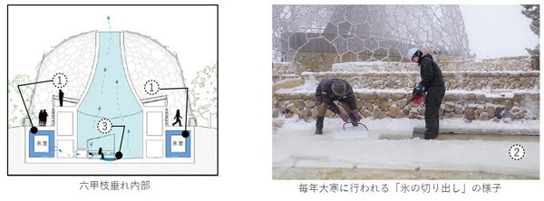 展望台内部の「1. 氷室(ひむろ)」には冬に「2. 氷棚(ひょうだな)」に張った天然の氷を切り出して貯蔵しています。夏に氷室を開いて風を取り込むと、氷室を通った冷たい風が展望台内部へ送られます。展望台の内部は天然のクーラーで冷やされ真夏でも20℃程度に保たれます。