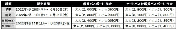 ※ナイトパス付鑑賞パスポートは有料会場への入場と、夜間作品を期間限定で公開する「ひかりの森~夜の芸術散歩~」会場への入場がセットになったパスポートです。「ひかりの森~夜の芸術散歩~」は9月23日(金・祝)~11月23日(水・祝)の土日祝、17:00~20:00の限定開催となります。ご鑑賞にはナイトパス付鑑賞パスポートまたはナイトパス(大人1,600円 / 小人800円)が必要です。