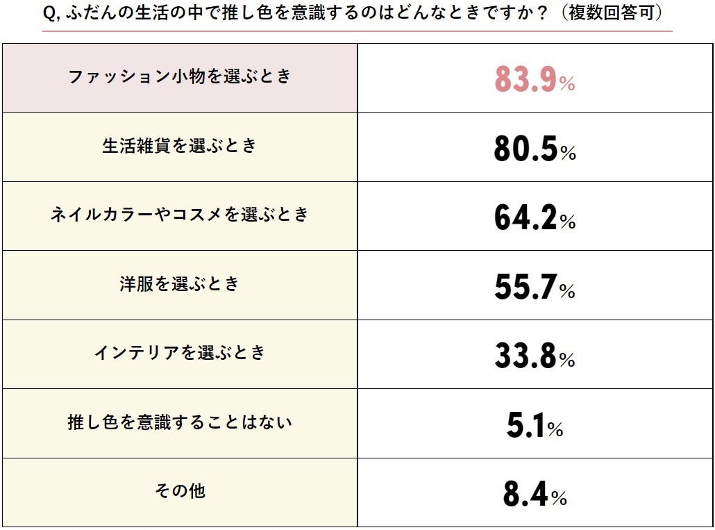 「ファッション小物を選ぶとき」「生活雑貨を選ぶとき」が8割以上と高く、「ネイルカラーやコスメを選ぶとき」が6割以上、「洋服を選ぶとき」が5割以上という結果でした。面積が大きい洋服よりも、ファッション小物や生活雑貨など、差し色的に取り入れる人が多いようです。その他の中には、「ヘアカラー」「デスク回りの文房具を推し色にすると仕事ががんばれる」、「レターセット」、「スマホの壁紙」、「食べ物や生活用品すべてに意識する」という回答がありました。