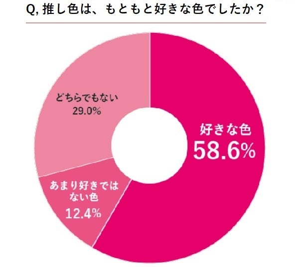 推し色をもともと好きだった人の割合は6割ほどでした。偶然推しになった人やキャラクターの担当カラーが、自分好みの色とは限りません。次に、その推し色に対してどう思っているのかを聞きました。