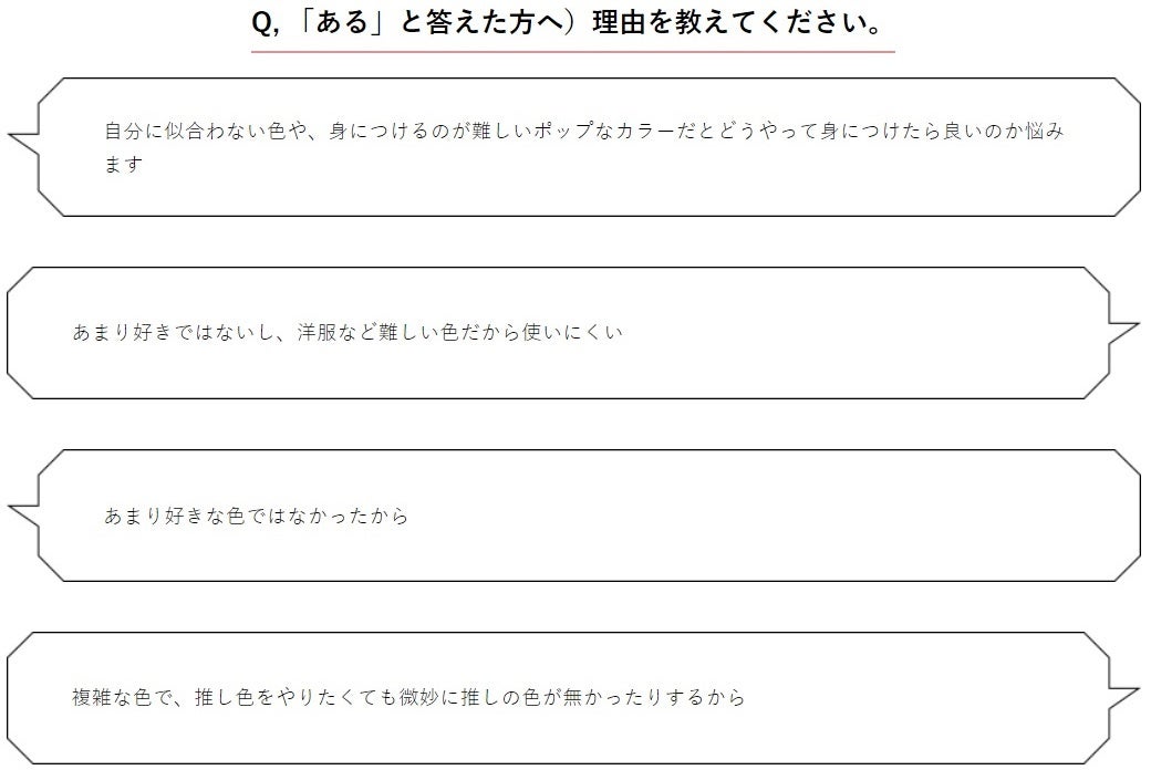 推しに合っている、自分に似合う、取り入れやすい、商品が多いなどの意見があり、また推しの色なので受け入れる、という人も多いようです。また、「好きになる人やキャラのメンバーカラーがいつも同じ」という、運命を感じさせるような回答もありました。