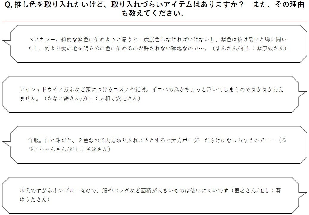 ◆推し色を取り入れたいけど、取り入れづらいアイテムはありますか? また、その理由は?