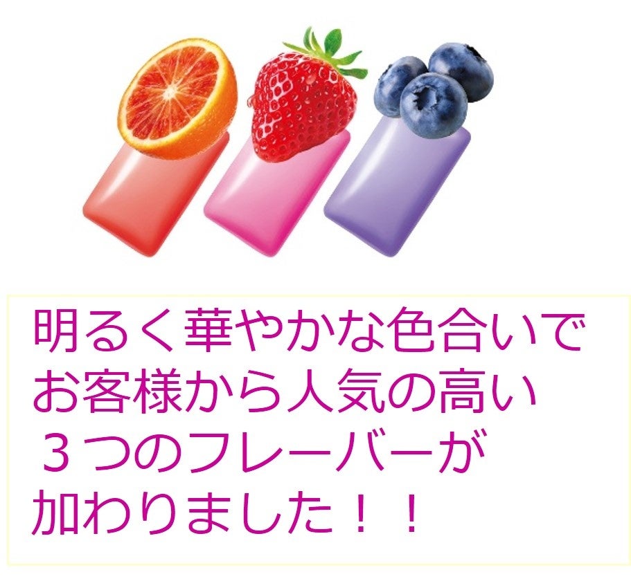 7種の味わい (グレープ・ピーチ・マスカット・スウィーティ・ベリー・オレンジ・ライチ)のキシリトールガムがアソートされたボトルガムに、春から秋の期間限定で、ブラッドオレンジ、ストロベリー、ブルーベリーの3種類が加わりました。