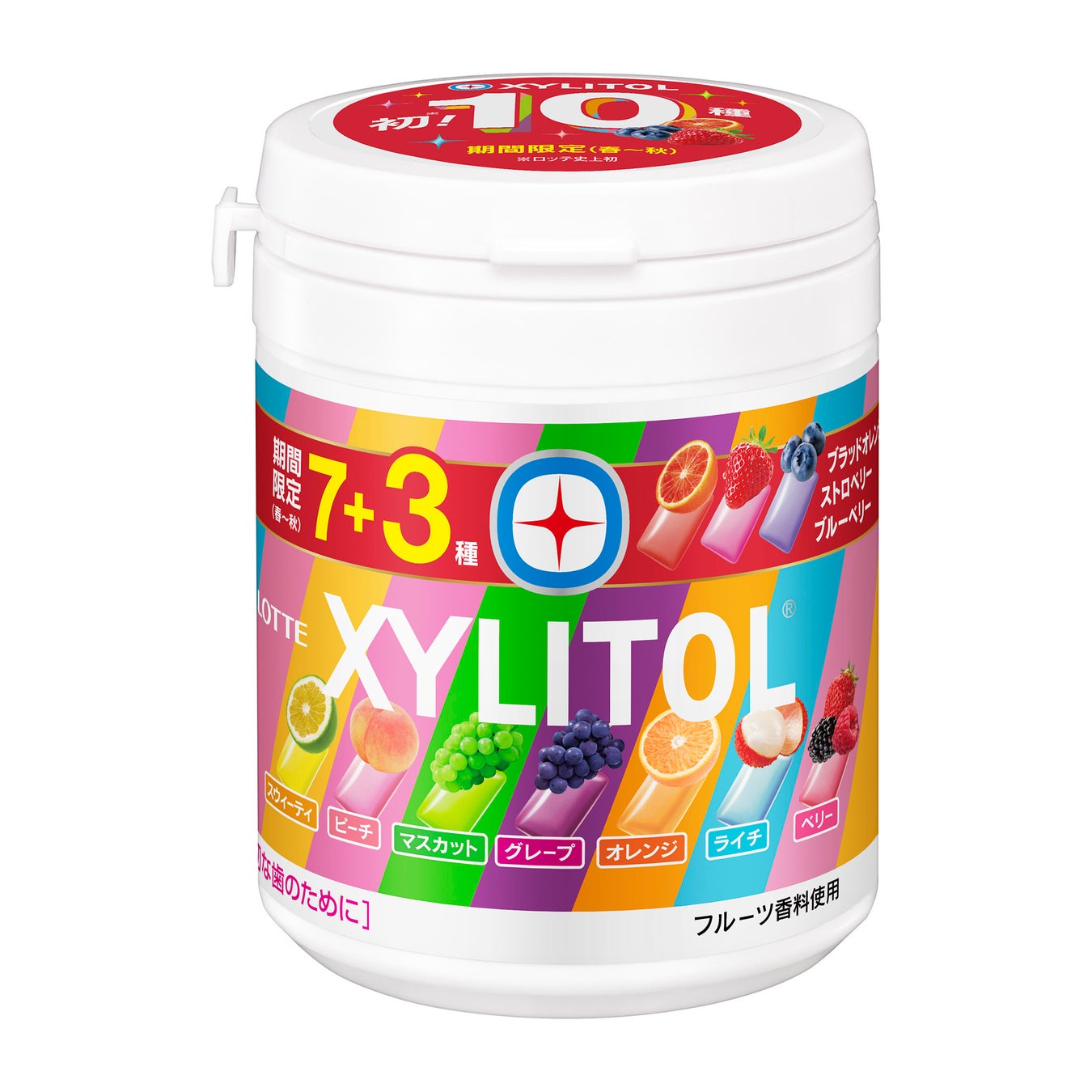 株式会社ロッテは、7種のフルーツフレーバーが楽しめる「キシリトールガム 7種アソートボトル」を期間限定(春~秋)でロッテ史上初の『10種アソート』として、2025年4月中旬より順次発売いたします。2016年の発売以来、たびたび期間限定で「7+1=8種アソート」を発売しておりますが、「7+3=10種アソート」は初めての試みです。これからの季節におすすめの「ブラッドオレンジ」「ストロベリー」「ブルーベリー」の3種のフルーツの味わいが期間限定で楽しめる、カラフルなアソートガムをその日の気分に合わせて、ぜひお楽しみください。