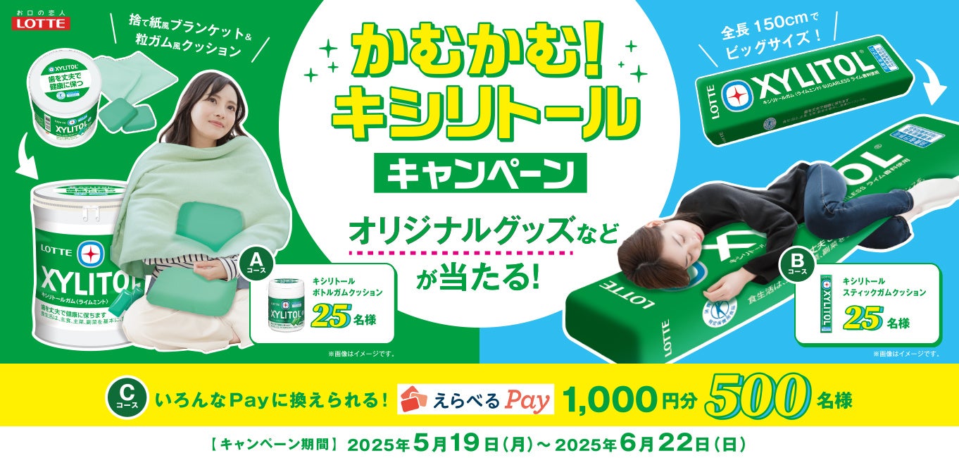対象となるロッテキシリトールガムを500円(税込)以上購入し、WEBまたはハガキで応募すると、抽選でオリジナルグッズなどがあたるキャンペーンを実施します。ぜひご参加ください。
