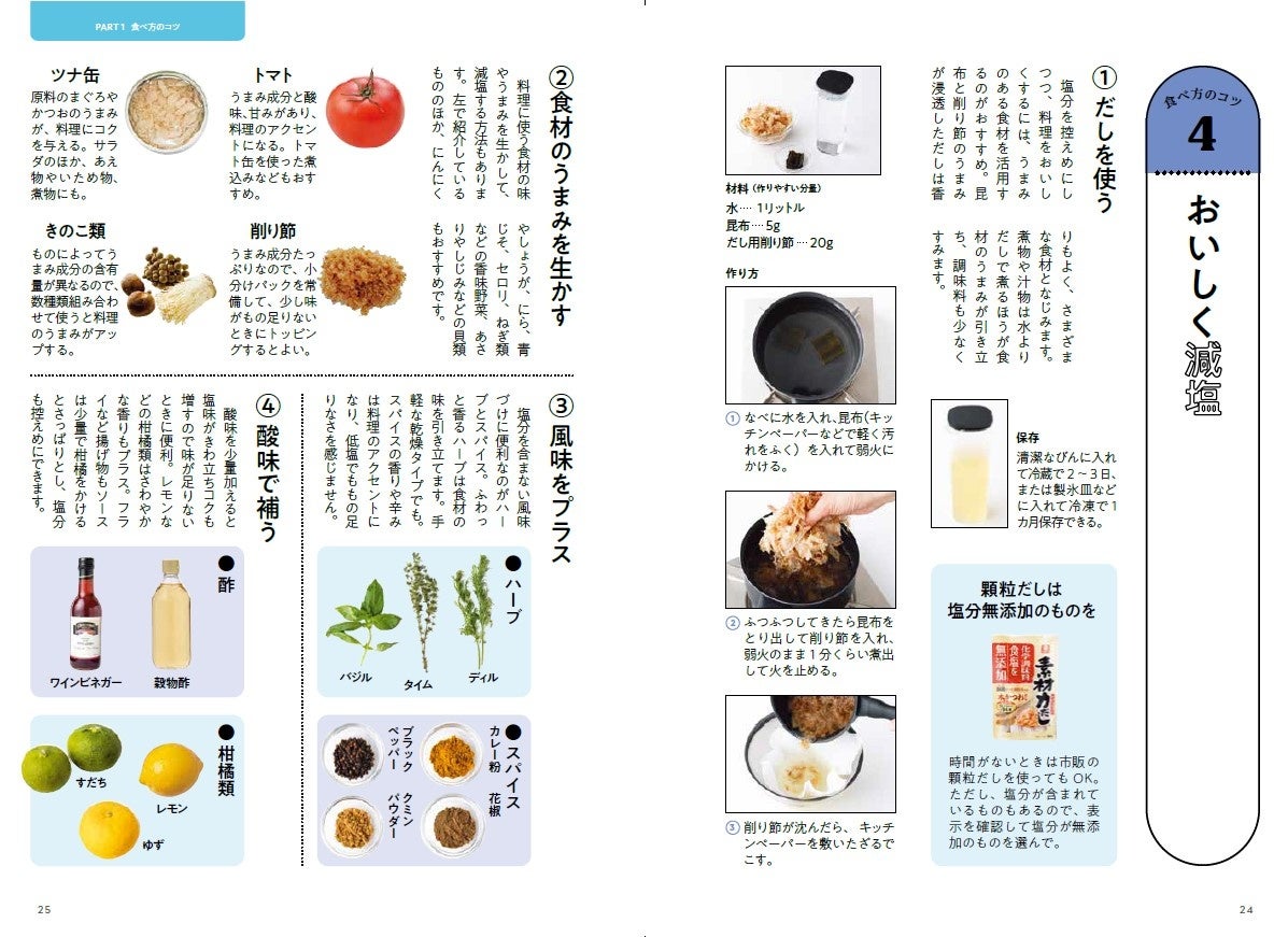 「みんな大好きテッパン料理を減塩で!」、「脂質控えめでも大満足!のおかずカタログ」など、差し替え用のおかずもたっぷり紹介。おいしく続けられる簡単レシピで、数値改善を目指す毎日をサポートします。