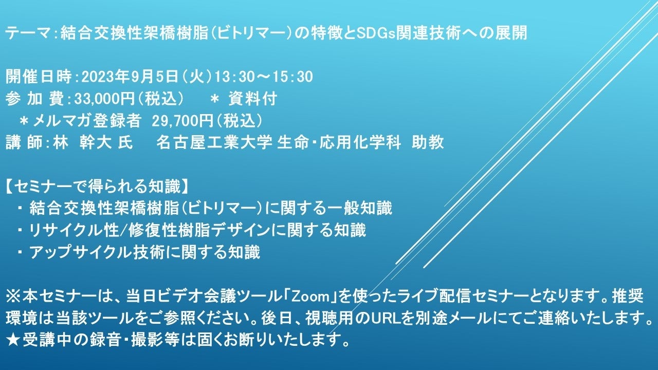 【ライブ配信セミナー】結合交換性架橋樹脂(ビトリマー)の特徴とSDGs関連技術への展開 9月5日(火)開催 主催:(株)シーエムシー・リサーチ
