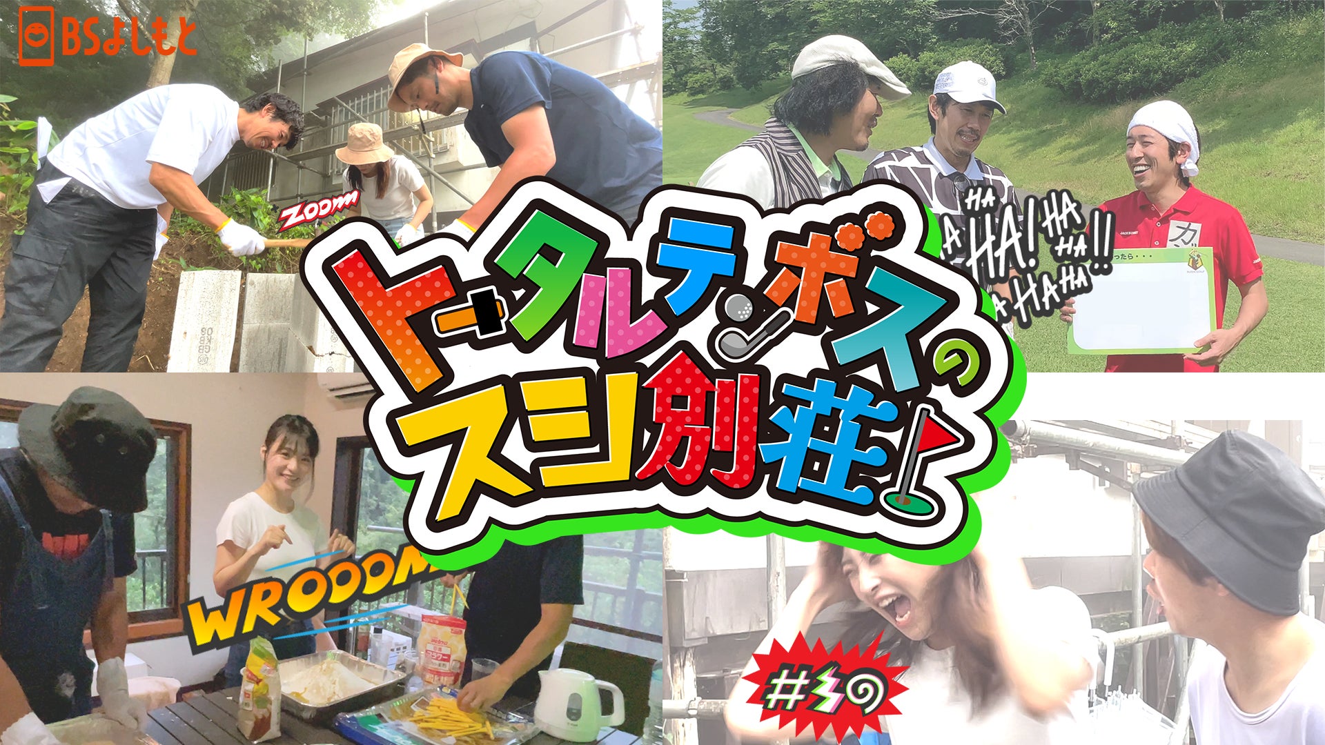 BSよしもとでは、トータルテンボスのYouTubeチャンネル「トータルテンボスのSUSHI★BOYS」のメンバー(トータルテンボス 大村朋宏・藤田憲右・パジャマとりや・滝口博史・カナブン坂本)がスペシャルゲストを別荘にお招きしてDIYを手伝わせる特別番組「トータルテンボスのスシ別荘SP」を9月3日(日)に放送します。