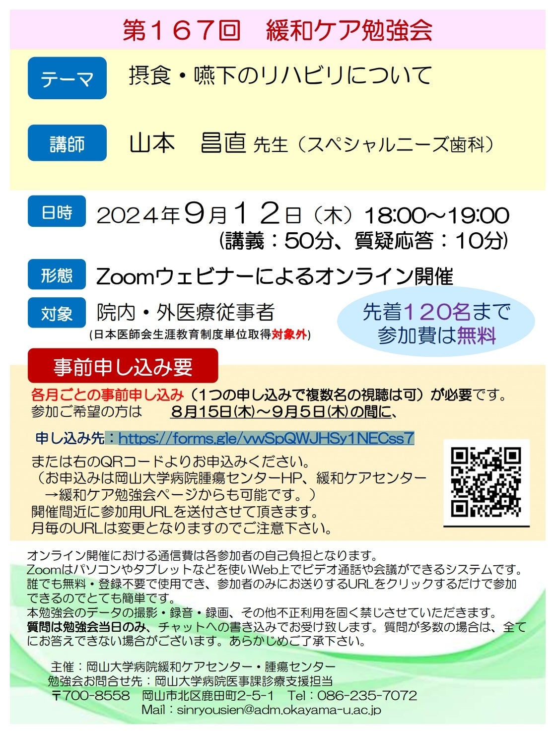 【岡山大学】岡山大学病院 第167回緩和ケア勉強会「摂食・嚥下のリハビリについて」〔9/12,木 オンライン開催〕