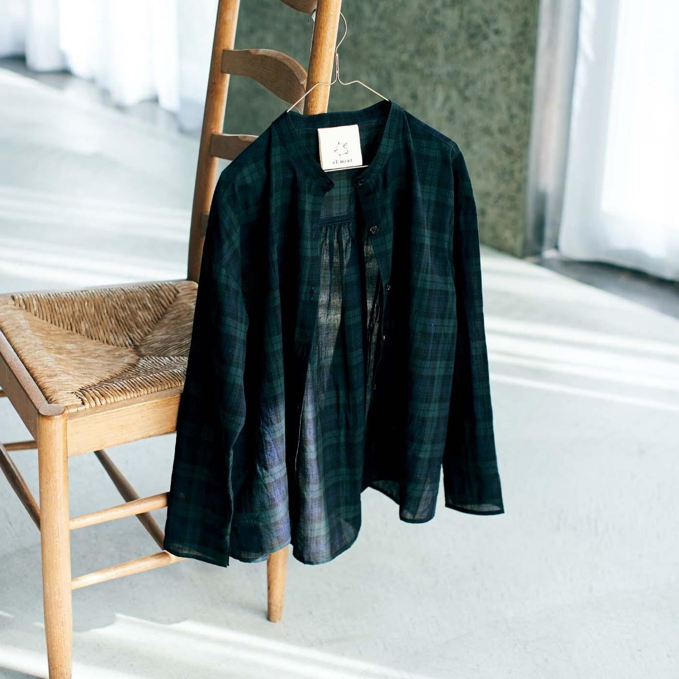 【NEW】el:ment 軽やかに播州織をまとう 繊細やわらかローン生地のバックギャザー羽織(はお)りシャツ〈ブラックウォッチ〉