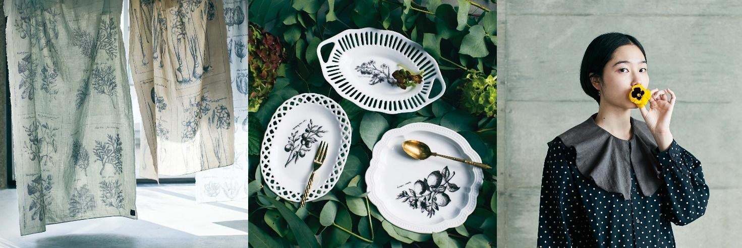 フェリシモ「el:ment[エル:メント]」から、春の新作、ヴィンテージ植物画の「ダブルガーゼマルチクロス」や「美濃焼の磁器プレート」が登場