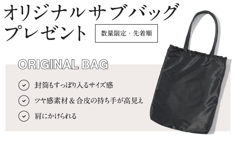 セレモニーアイテム発売を記念し対象商品を税込み25,000円以上購入で、オリジナルサブバッグを数量限定・先着順でプレゼント(店頭・WEB共に実施)。大判の封筒もすっぽり収まるマチ付きの嬉しいサイズ感で、シンプルで上品な光沢感と、重い書類などを入れられる丈夫さを兼ね備えています。肩にかけられる長めのフェイクレザーの持ち手や、さりげない上部のフリルデザインで高見えを叶えてくれます。