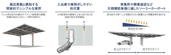 「DREAM Port」は、事業所や商業施設、工場などの建物の景観に溶け込むデザインを採用したソーラーカーポートです。