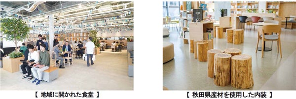 地域住民や寮生の交流促進、地産地消の推進、従業員と地域住民の健康増進を軸に、交流広場や、食堂・シェアキッチン・スポーツジムを中心とした共用棟を設置しました。地産地消としては、秋田県産食材を使用した料理だけでなく、自然エネルギーや建材にも秋田県産を多く取り入れ、地域とのつながりを深めています。また、地元の様々な団体と連携して秋田の文化を伝えるイベントを実施しており、「ZiNOBA」の開業から2年で延べ約3,200名の地域の方々に利用していただきました。