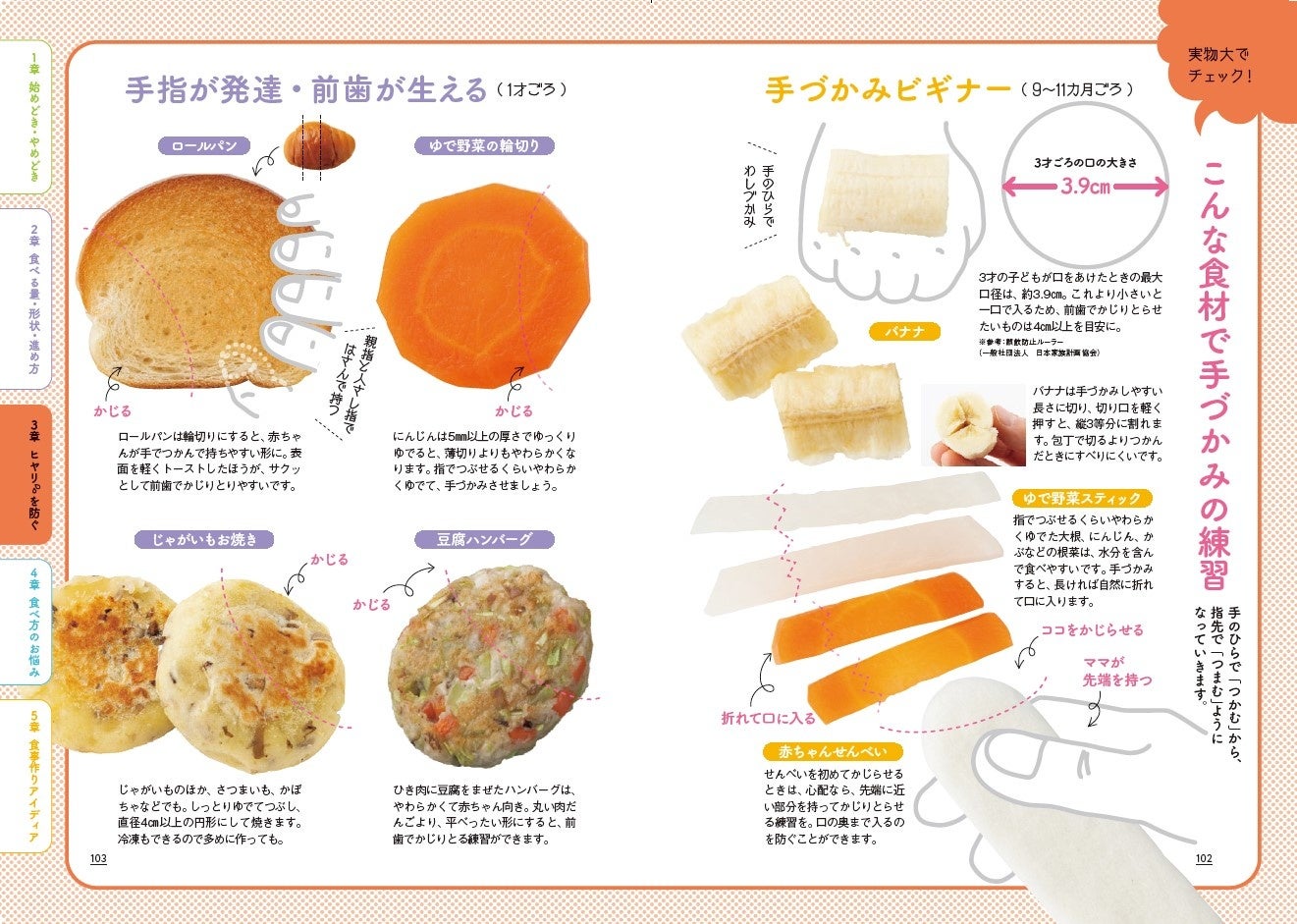 第3章「食事のヒヤリをどう防ぐ?」では、3才ごろの口の大きさと食材のサイズを実物大で掲載。手づかみ食べの注意点をまとめた実践に役立つ情報も必見です。のどに詰まったり、気管に入ったりする事故を防ぐポイントも丁寧に押さえました。