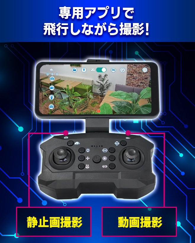 200万画素のメインカメラと30万画素のオプティカルカメラを搭載し、リアルタイムで高画質映像を専用アプリで表示・撮影保存。動画はFHD、静止画は2K相当からアプリによるアップスケーリングで4K・8K相当まで対応可能。オプティカルセンサーなどによる安定飛行に加え、ワンプッシュ離着陸やカメラの可動(手動)など操作性も良好です。対象年齢は8歳以上。プロペラや本体、室内の物との飛行時の接触などを避けるためのプロペラガードがスタイリッシュかつ高い安全性を両立させたこだわりの一台です。