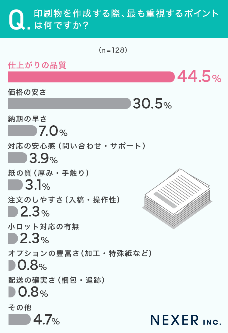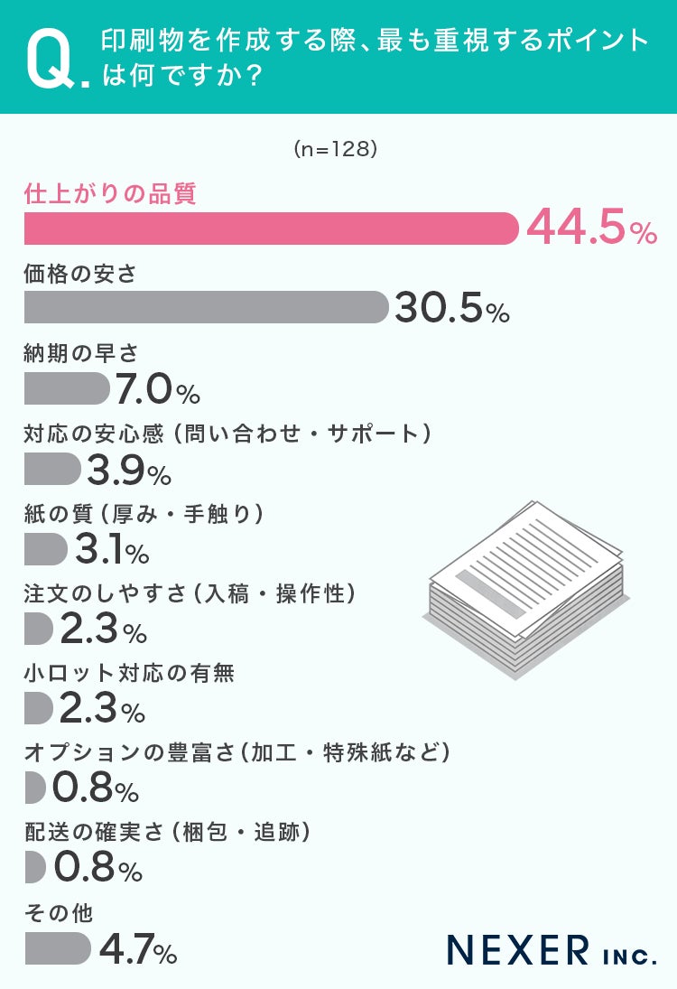 ■44.5%が、印刷物を作成する際に最も重視するポイントは「仕上がりの品質」と回答