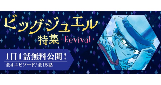 本特集では、「江戸川コナン」と「怪盗キッド」のビッグジュエルをめぐる攻防が描かれたエピソードをピックアップした特集のリバイバルを実施します。「名探偵コナン公式アプリ」内にて、全4エピソード15話を、1日1話無料でお読みいただけます。プレミアムクラブ会員の方は、公開された話は期間中いつでも無料購読できます。会員ではない方も期間中、第44巻の「怪盗キッドの驚異空中歩行」と各エピソードの1話目は、公開後いつでも無料購読できます。