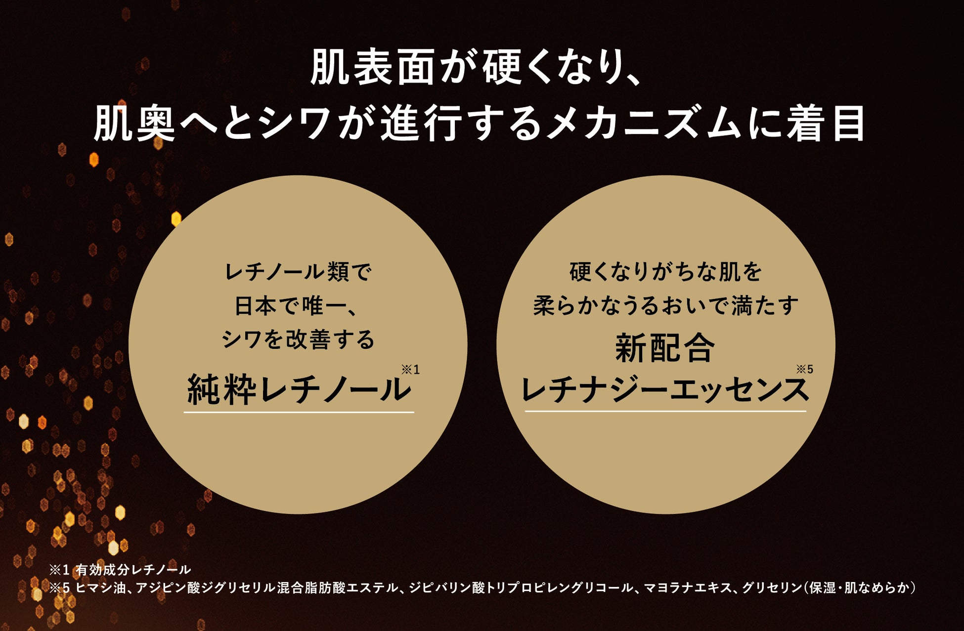 ◆肌表面が硬くなり、肌奥へとシワが進行するメカニズムに着目。硬くなりがちな肌を柔らかなうるおいで満たす独自成分「レチナジーエッセンス※5」を新配合。