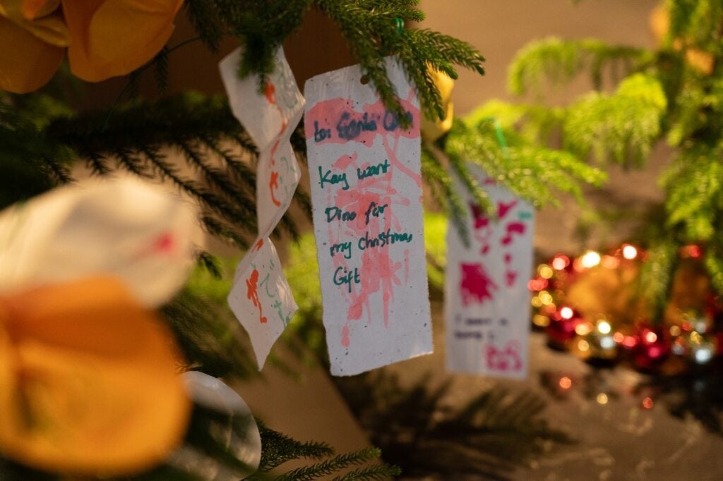 子どもたちがサンタさんへの願いごとや“ありがとう”を書いて飾れるツリー。