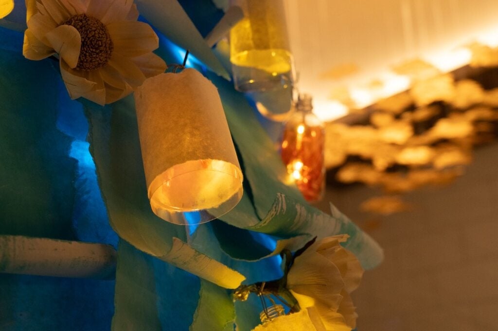 周囲のランタンはPETボトルを再利用して制作し、福井の星空を思わせる優しい明かりを灯します。