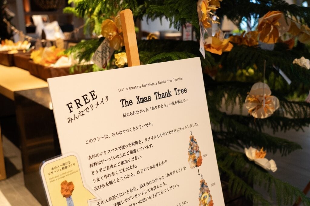 昨年ホテルで使用したクリスマス装飾を再利用し、小さな花びらを開いて“ありがとうのメッセージ”を添える参加型アート。近くの人には直接手渡し、遠くの人にはツリーに飾り、想いを届けることができます。