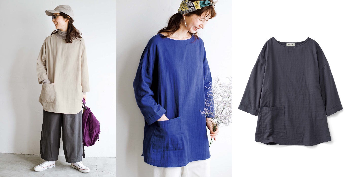 体形をカバーするふわっとしたシルエットが特徴の、綿100%のダブルガーゼチュニックです。一枚で着るのはもちろん、インにタートルを合わせたり、コートやカーディガンをはおったりと3シーズン着まわせます。定番としてずっと愛用したい着心地です。