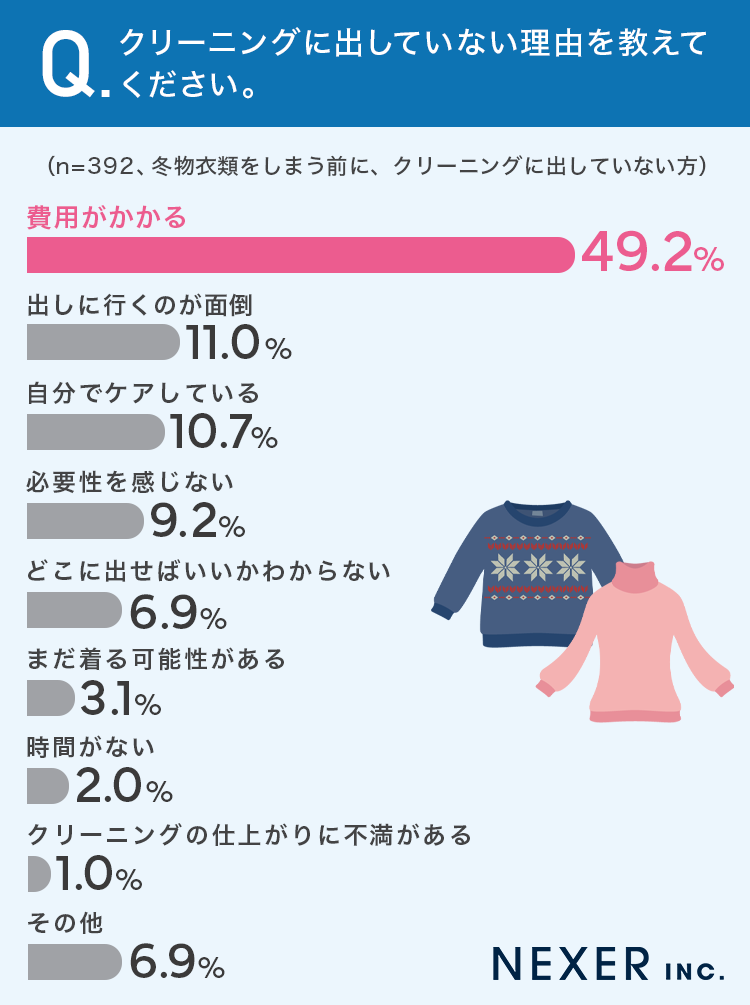 今回の調査では、冬物衣類をしまう前にクリーニングに出している人は約2割にとどまり、多くの人がコストや手間を理由にクリーニングを利用していないことがわかりました。